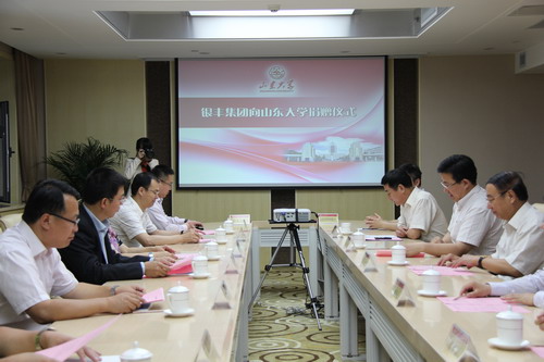 2013年5月17日,山東銀豐投資集團(tuán)有限公司向山東大學(xué)捐贈簽約儀式在山東大學(xué)中心校區(qū)舉行。銀豐集團(tuán)向山東大學(xué)捐贈400萬元人民幣,支持山東大學(xué)教育事業(yè)發(fā)展。校黨委書記、校董會主席李守信在儀式上講話并向銀豐集團(tuán)董事長王偉頒發(fā)校董聘書。總會計師曹升元與王偉共同簽署了捐贈協(xié)議,并代表學(xué)校向王偉頒發(fā)了捐贈證書。