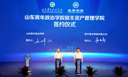 在各位嘉賓的共同見證下,山東青年政治學(xué)院副院長(zhǎng)王林山、銀豐物業(yè)集團(tuán)總裁龐亞平鄭重簽訂了合作協(xié)議,與會(huì)領(lǐng)導(dǎo)和嘉賓共同為山青院銀豐資產(chǎn)管理學(xué)院揭牌。